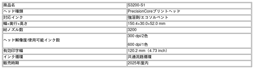 セイコーエプソン株式会社(以下 エプソン)は、工業応用分野の量産用途に適した強溶剤対応の新たなインクジェットプリントヘッド「S3200-S1」を市場投入します。「S3200-S1」は、PrecisionCore プリントヘッドシリーズの新たなラインアップで、強溶剤対応・広幅・高解像度を特⾧とし、ペロブスカイト太陽電池など先端分野におけるインクジェット技術の活用を一層加速します。