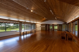 (天候の良い日には大きな窓から富士山を望める木に囲まれた空間)