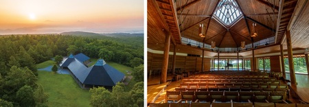 標高1,500m、高原の山々に馴染む美しい六角形と暖かい木のぬくもりが特徴の八ヶ岳高原音楽堂。「世界でも通用するような建物を」というピアニスト、スヴャトスラフ・リヒテルの助言のもと、1988年(昭和63年)に誕生。自然と環境に調和した美しい建築として「’89年毎日芸術賞」「’89年東京クリエイション大賞環境賞」を受賞しています。音響面では主に室内楽の演奏を想定し、理論に基づく実験と人の耳による確認を繰り返してついに小ホールとして理想的な残響1.6秒を得ました。木のホールならではの耳に心地よい柔らかで自然な響き、音楽のすべての魅力を届ける音楽施設です。