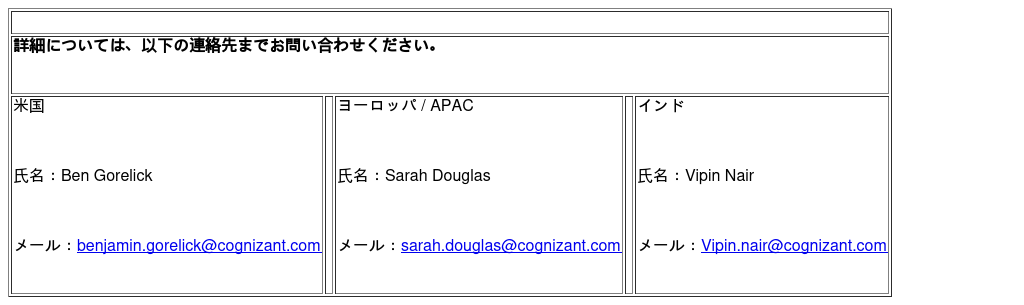 本プレスリリースには、1995年米国私的証券訴訟改革法のセーフハーバー規定に基づく将来の見通しに関する記述が含まれており、これらの情報の正確性は、将来の出来事に関するリスク、不確実性、および仮定に左右され、必ずしも正確であるとは限りません。これらの記述には、3Cloudの事業に関する明示的または黙示的な将来の見通しに関する記述が含まれますが、これらに限定されません。これには、予想される成長、提案されている取引の予想される利益(シナジー効果、新たな事業機会、成長に関連する予想される利益を含む)、取引完了の予想時期、統合後の会社の計画、目的、期待、意図、およびその他の歴史的事実ではない記述が含まれます。これらの記述は約束や保証ではなく、さまざまなリスクや不確実性の影響を受けます。その多くは私たちの制御を超えており、実際の結果がこれらの将来の見通しに関する記述で想定されている内容と大きく異なる可能性があります。既存および将来の投資家の皆様は、これらの将来の見通しに関する記述に過度に依存しないようご注意ください。これらの記述は、本書の日付時点の情報に基づいています。実際の結果が表明または暗示された内容と著しく異なる要因には以下が含まれます。取引から期待される利益が完全には実現しない、または実現までに予想以上の時間を要するリスク;取引の発表および進行中の状態による当事者企業の事業への混乱;取引に必要な承認を想定したスケジュールで、あるいは全く得られない可能性、および当該承認が取引完了後に当社に悪影響を及ぼす条件を課す、あるいは取引の予想される利益に悪影響を及ぼす条件を課すリスク;評判リスクおよび各社の顧客、サプライヤー、従業員、その他のビジネスパートナーによる本取引への反応;取引契約におけるクロージング条件が満たされない場合、または取引のクロージングに予期せぬ遅延が生じる場合、もしくは取引契約の終了を引き起こす可能性のある事象、変更、その他の状況が発生する場合;予期せぬ要因や事象の結果を含め、取引の完了に予想以上の費用がかかる可能性;取引後のCognizantの拡大した事業および運営の管理・監督に関連するリスク;3Cloudの事業および運営をCognizantに統合する際に、予想以上にコストがかかり困難となるリスク、または予期せぬ要因や事象の結果を含め、3Cloudの事業を当社事業と統合できないリスク;一般的な競争環境、経済状況、政治情勢、市場環境、その他当社または3Cloudの将来の業績に影響を及ぼす可能性のある要因(これには、一般的な経済状況、当社が競争する市場の競争的かつ急速に変化する性質、人材獲得競争とその従業員の採用・定着への影響、AIベースの技術を効果的に活用する当社の能力、サイバー攻撃に起因する法的・評判・財務リスク、移民や税制を含む規制環境の変化などが含まれます)。将来の業績に影響を与える可能性のあるその他の要因については、最新の年次報告書(Form 10-K)および米国証券取引委員会(SEC)へのその他の提出書類に記載されています。Cognizantは、新たな情報、将来の出来事、またはその他の結果にかかわらず、適用される証券取引法で義務付けられている場合を除き、いかなる将来の見通しに関する記述を更新または修正する義務を負いません。