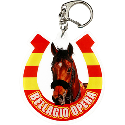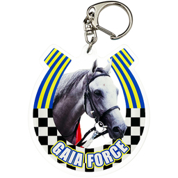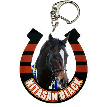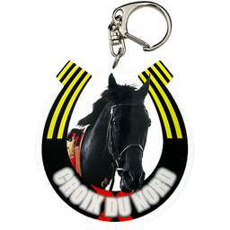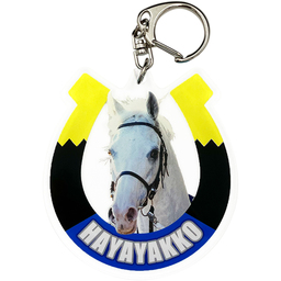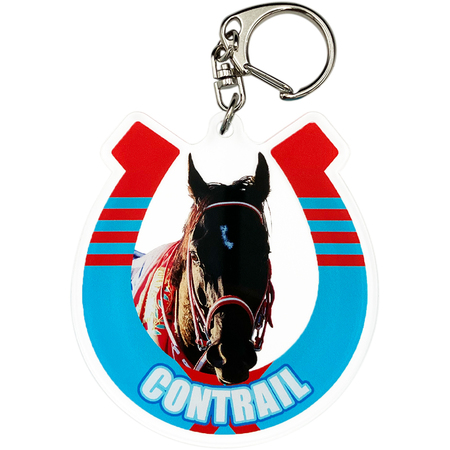 アクリルキーホルダーは、蹄鉄をイメージした勝負服柄の枠に競走馬の肖像を配置しました。