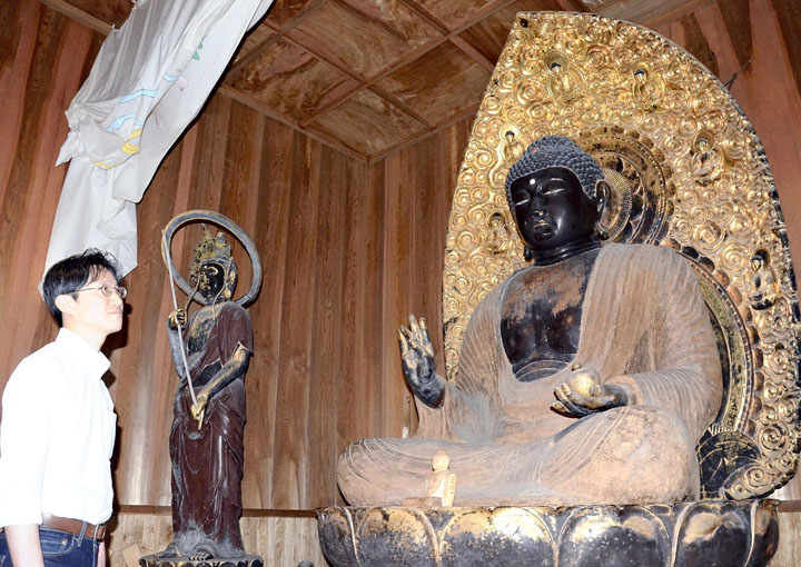 コンクリート製の収蔵庫の鉄の扉を斎藤さんが開けると、重々しく黒光りした仏像が鎮座していた。国重要文化財の「薬師瑠璃光如来坐像」。像高183センチ。両脇に日光、月光2体の菩薩像を従える。戦前は国宝だった時期もあるという。斎藤さんは「湯川村にある国宝の薬師如来像よりも大きい」と誇らしげだ。