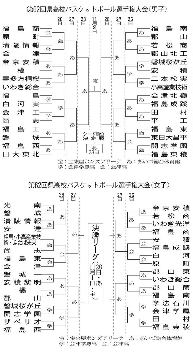 第78回全国高校バスケットボール選手権大会(ウインターカップ)県予選会を兼ねた第62回県高校バスケットボール選手権大会は26日、会津若松市で開幕する。組み合わせ抽選が3日に行われ、対戦カードが決まった。男女各32チームが出場し、男女の優勝校がウインターカップに出場する。