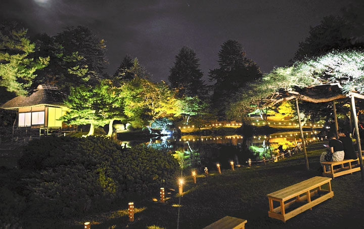 会津若松市の国指定名勝・会津松平氏庭園「御薬園」のライトアップは3日、同園で始まった。美しい幻想的な庭園が演出され、来場者が秋の夜風を感じながら散策を楽しんでいる。5日まで。期間中は入園無料。