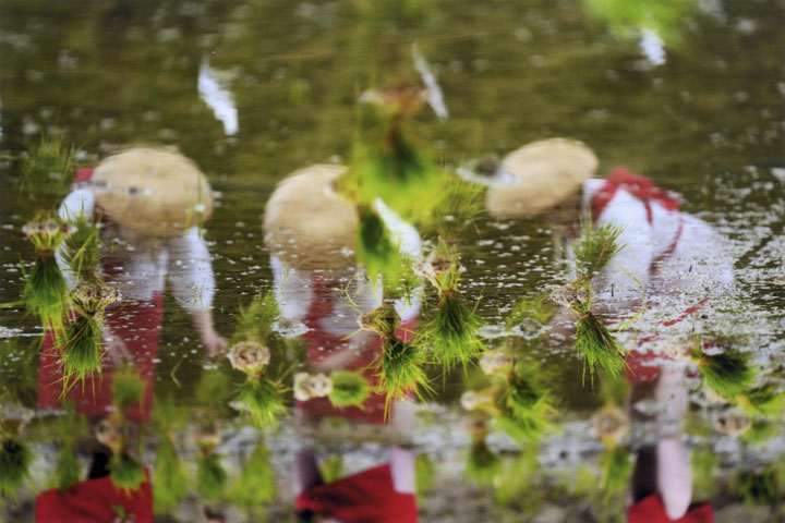 【評】例大祭の田植え行事。写真を上下逆に見せることで、田植え姿が絶妙なバランスで水面に映り込み、いい雰囲気を醸し出しています。