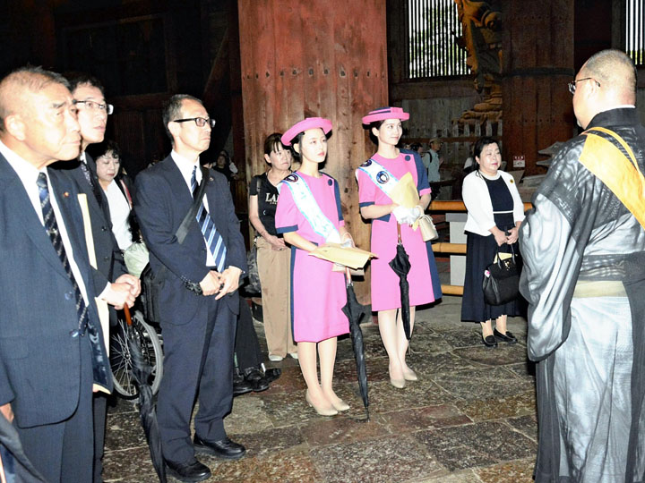 使節団は東大寺や興福寺を見学。采女神社では椎根市長が宵宮祭の神事で玉串をささげ、ミスうねめらが絵馬を奉納した。