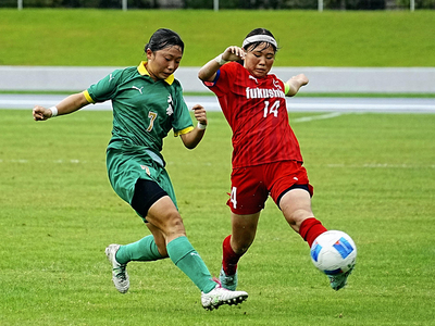 【サッカー少年女子準決勝】相手と激しく競り合う福島代表主将の岸上詩音(ふたば未来高)(右)=皇子山総合運動公園陸上競技場