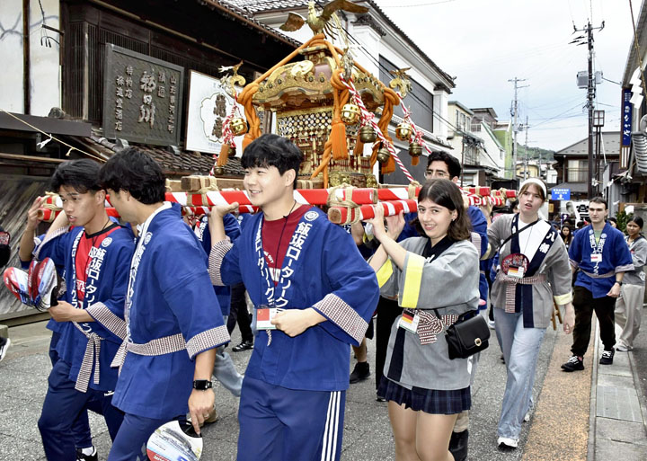 福島市の飯坂ロータリークラブ(RC)は4日、「飯坂けんか祭り」に合わせて第32回国際交流フェスティバル「ザ・まつりin飯坂」を開いた。福島大の留学生など外国出身者ら約60人が「国際みこし」を担いで温泉街を練り歩き、日本の伝統文化に触れた。