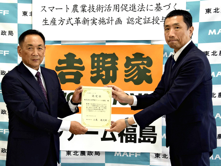 東北農政局は7日、水稲栽培にスマート農業技術を取り入れる「生産方式革新実施計画」が国から認定を受けた吉野家ファーム福島(白河市)に対して認定証を授与した。認定証の交付は県内で2例目。