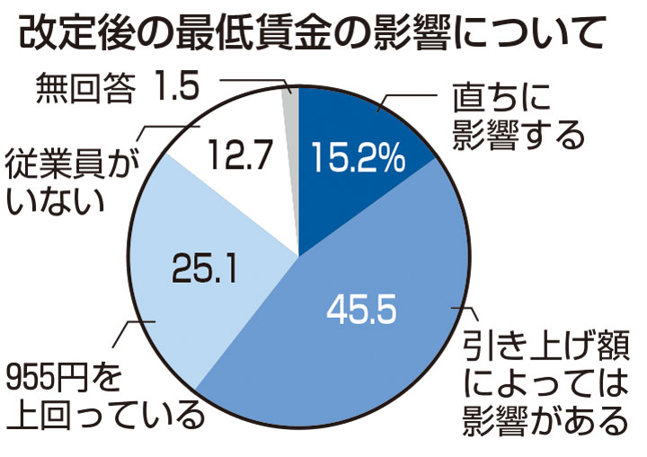 本県の最低賃金は来年1月から、現行の時給955円から初の千円超えとなる1033円に引き上げられるが、調査は決定前の8月8日~9月2日に実施。598事業所が回答した。「955円を上回っている」は150事業所で25.1%、「従業員の雇用がない」が76事業所の12.7%だった。