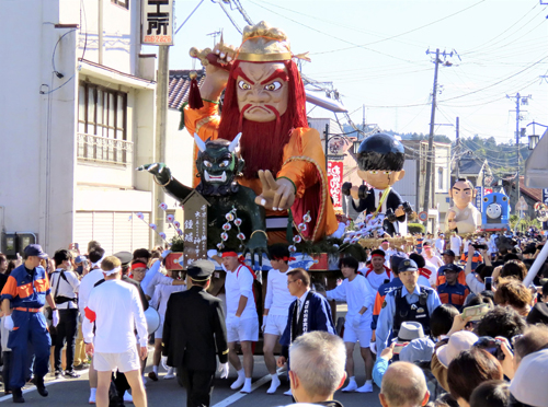 二本松市針道の針道商店街目抜き通り。午後1時30分~同3時30分。高さ3メートルもある大型人形を載せた7町の山車をぶつけ合う。人形は「日本昔話」が統一テーマで桃太郎や金太郎、一休さんなどが登場する。問い合わせは東和観光協会(電話)0243・66・2490
