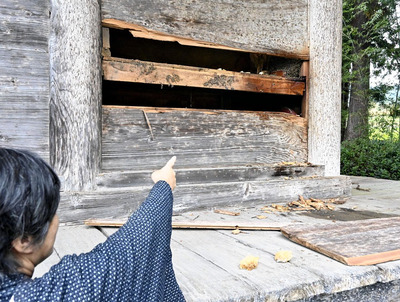 住職によると、板張りの外壁が引き剥がされたように壊されており、内部にはニホンミツバチの巣があった。住職は「寝ていたら『ダンダン、ベキ』という物音が聞こえた。音は5分ほど続いたので、とても怖かった」と振り返った。