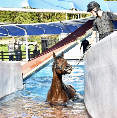 プールは水深3メートル、1周約40メートル。けがをした馬が下肢部に負担をかけずに心肺機能を鍛えることができる。今年は5月にプール開きを行い、これまでに9頭が利用した。