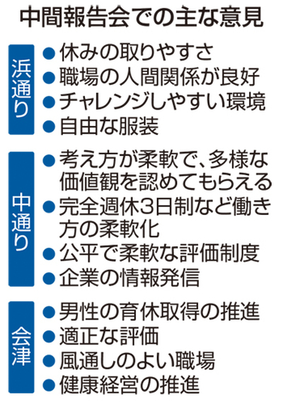 人口減少対策に若者の視点を取り入れるため、学生を中心に福島県が組織した「チーム」の中間報告会が15日、福島市で開かれた。若者に選ばれる魅力的な企業づくりに向けた課題として、若者の意見が聞き入れられる雰囲気づくりや柔軟な働き方、公平な評価制度などが多く挙げられた。 チームは、学生を中心に市町村、企業の若手職員らで構成。浜通り、中通り、会津にそれぞれ設置され、企業訪問などを経て意見をまとめた。各チー...