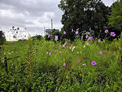 農園に去年植えたコスモスの種があちこちに飛んで、今年は結構カラフルな景色が見られます。