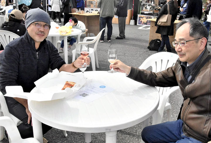 同町の新鶴ワイナリーなど県内外の12のワイナリーが出店。会津地鶏のソーセージなどワインに合う料理も並び、町内外の来場者でにぎわっている。来場した同町の男性(41)は「野外でおいしいお酒を飲めてうれしい」と笑顔だった。