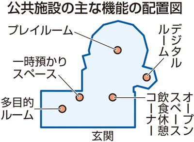 施設の延べ床面積は約2100平方メートルで1階建て。駐車場は約200台分のスペースを確保する。利用料金は施設や駐車場の利用が原則無料、乳幼児の一時預かり事業は有料で検討している。利用開始は2028年5月の予定。
