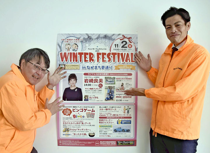 午後5時45分から、郡女大付高生徒によるプロジェクションマッピングと同組合によるイルミネーションの点灯式も行う。根本浩典実行委員長、橋本謙一副理事長は「ぜひ来場を」と呼びかけた。問い合わせは同組合(電話024・922・2838)へ。