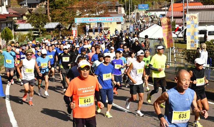 第56回東和ロードレース大会は2日、二本松市の太田住民センターグラウンド前特設ゲートを発着点に開かれた。2、5、10キロの29部門に県内外から1152人がエントリーし、晩秋の東和路を駆け抜けた。  最長10キロ種目のうち一般男子40代で後藤拓馬(山形県)が32分48秒の大会新、一般女子高校生以上で福元可愛(茨城県)が43分59秒で、それぞれ優勝した。大会実行委、二本松市、市教委、市スポーツ協会...