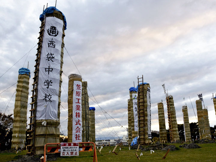 福島県須賀川市伝統の火祭り「松明(たいまつ)あかし」は8日、同市の翠ケ丘公園五老山をメイン会場に繰り広げられる。本番を前に参加団体による本松明が立てられ、会場設営が進んでいる。市などでつくる実行委員会の主催。