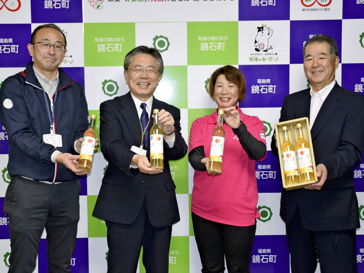 同公社の長田守弘理事長、八木操駅長、町地域おこし協力隊の寺内功一さん、ワタナベフルーツファームの渡辺美恵さんらは4日、町役場を訪れ、木賊正男町長らに商品の完成を報告した。問い合わせは同まちの駅(電話0248・94・8110)へ。