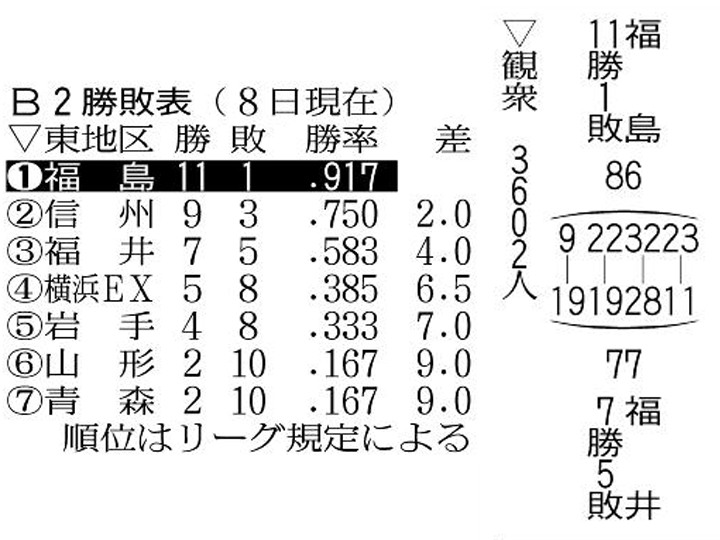 バスケットボール男子Bリーグ2部(B2)東地区の福島ファイヤーボンズは8日、ホームの宝来屋ボンズアリーナで同地区の福井に86―77で勝利し、クラブ初の10連勝を達成した。通算成績は11勝1敗で東地区首位。福島は9日も同会場で福井と対戦する。午後1時35分開始予定。