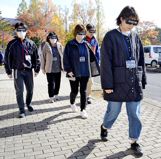 参加者は、視覚狭窄(きょうさく)や白濁の状態を疑似体験できる眼鏡を使って屋外を歩行したり、介助方法を体験したりするなど、より良い生活につながる寄り添い方について理解を深めた。