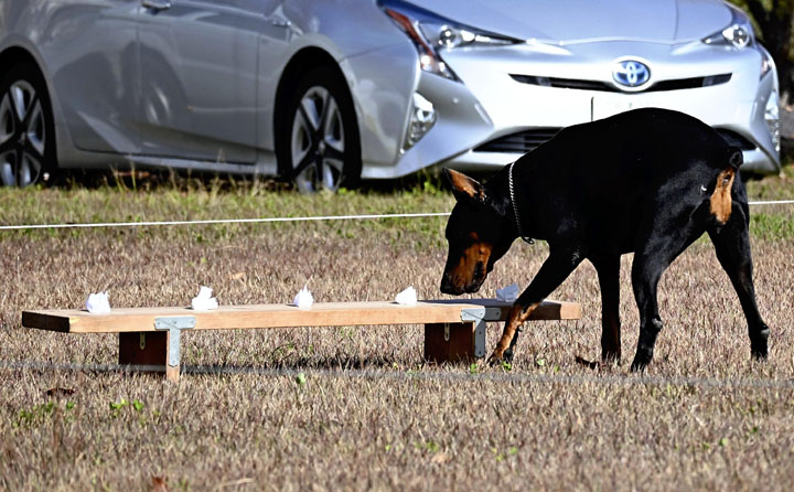 県警によると、現在21頭が嘱託犬として活動している。6日の開会式では、馬場孝二刑事部長が「警察犬は、犯罪の捜査や行方不明者の捜索などに欠かせない存在だ」とあいさつ。日本警察犬協会の伊藤尚本部審査員が「愛犬との訓練の成果を十二分に発揮してほしい」と参加者を激励した。