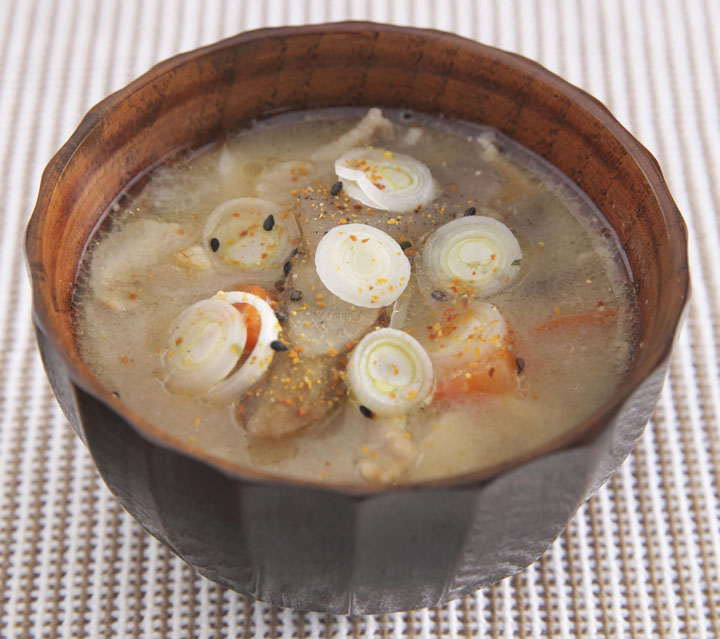 1人分112キロカロリー、塩分1.6グラム (1)2人分で豚ばら薄切り肉と大根、里芋、ニンジン、ゴボウ各30グラム、こんにゃく20グラム、ごま油小さじ1/2、みそ24グラム前後、白ネギ10グラム、七味唐辛子少々を用意します。 (2)肉は幅3センチに切ります。大根と里芋、ニンジンは厚さ5ミリのいちょう切り。ゴボウは斜めに厚さ5ミリに切って水にさらし、水気を切ります。こんにゃくはすりこ木でたたき、...