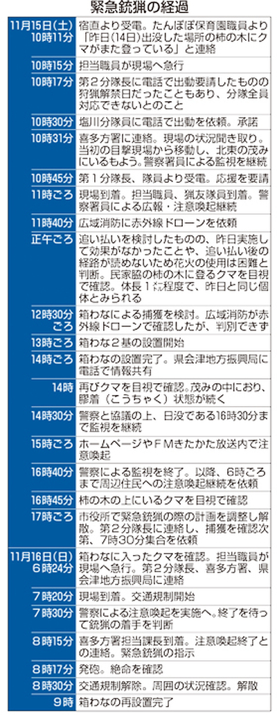 日曜日の朝、地元猟友会のメンバーが放った1発の銃声が辺りに響き渡った。喜多方市松山町で3日間にわたるクマと住民のにらみ合いは16日、県内で初めてとなる緊急銃猟で幕を閉じた。地域住民らは日常生活の脅威が取り除かれたことを歓迎する一方で、猟友会はハンターの心理的な負担を懸念する。 設置された箱わなの中にクマの姿が確認されたのは16日午前6時25分ごろ。市は箱わなを設置した15日の段階から緊急銃猟...