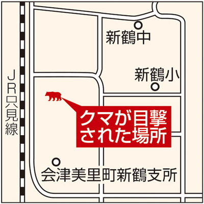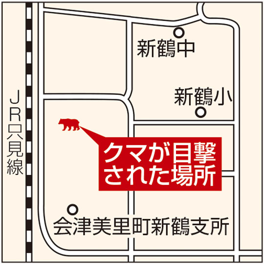 17日午後3時50分ごろ、福島県会津美里町鶴野辺字広町の介護施設駐車場でクマ1頭を目撃したと、40代男性従業員から町役場を通じて会津若松署会津美里分庁舎に通報があった。同分庁舎によると、クマは体長約0.5メートルで、駐車場を走り回った後、西側に逃げたという。