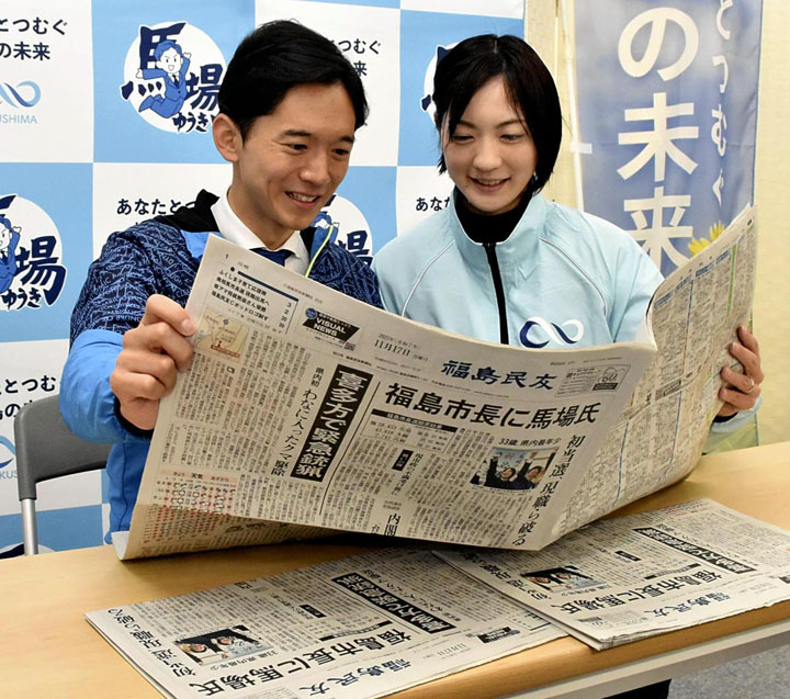 福島市長選で初当選を果たした馬場雄基氏は投開票から一夜明けた17日、同市本町の選挙事務所で選挙結果を伝える福島民友新聞などに目を通し、当選の喜びをかみしめた。「今後は市長として具体的な成果が求められる。覚悟を持って前に進む」と決意を新たにした。