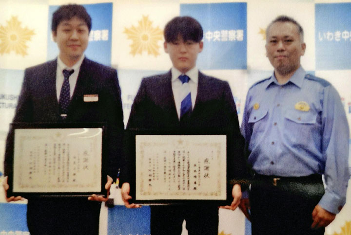 飲酒運転を未然に防いだとして、いわき中央署は10月27日、いわき市の「焼肉や漫遊亭いわき平店」の店長初見正雄さんとアルバイト店員の坂本晴喜さんに感謝状を贈った。