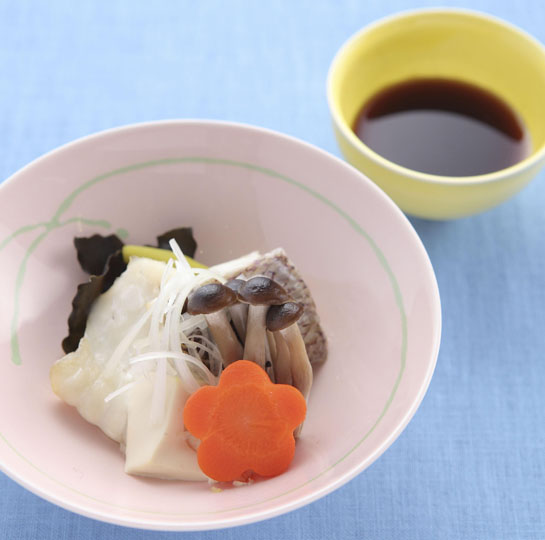 1人分118キロカロリー、塩分1.5グラム (1)2人分でタイ1切れ(100グラム)、絹ごし豆腐とシメジ各40グラム、厚さ3ミリのニンジン2枚、長さ10センチのだし昆布2枚、白ネギ10グラム、ポン酢しょうゆ大さじ2を用意します。 (2)タイは4等分のそぎ切りにします。塩少々を振って10分程度置き、ペーパーで拭いて酒小さじ1を振ります。豆腐は半分に切り、シメジは小房に分けます。ニンジンはもみじ型...