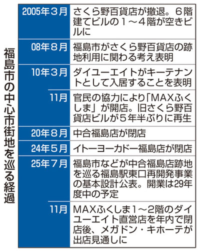 一方、MAXふくしまは05年に閉店したさくら野百貨店のビルに10年11月に開店した。中心市街地の空洞化を懸念する市の打診にダイユーエイトが応える形で出店。各階のテナントや福島まちづくりセンターが運営するアオウゼなどと共に官民一体の運営体制を取り、中心市街地活性化に貢献してきた。