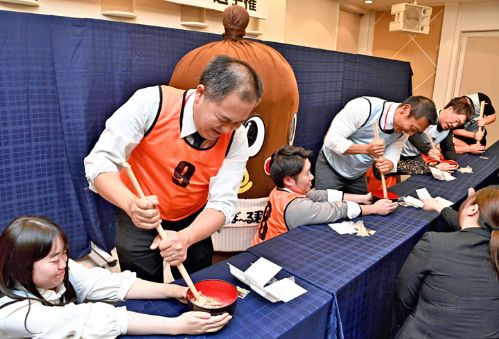 会場では、納豆の混ぜる回数を競う「まぜまぜ選手権」、糸を伸ばして距離を競う「のびのび選手権」も行われ、納豆ファンら県内外の10組が熱戦を繰り広げた。納豆のキャラクター「ねば~る君」も応援した=写真。