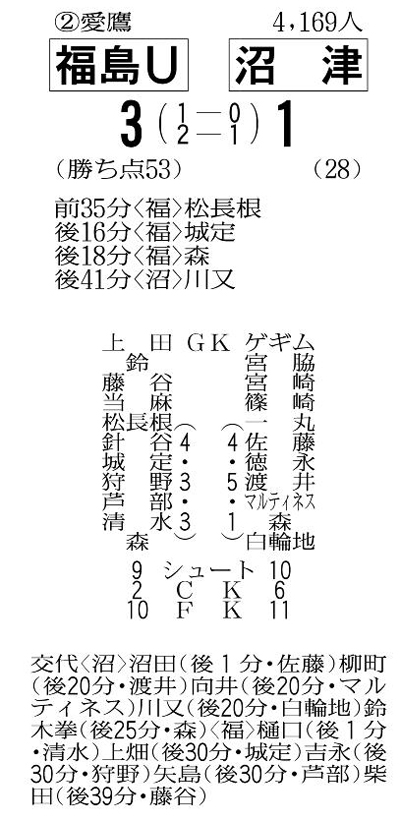 【評】福島が3得点で快勝した。前半35分には右サイドからのパスをDF松長根が頭で押し込んで先制した。後半、PKで同点のピンチを迎えたがGK上田が好セーブ。勢いに乗った福島はMF城定、FW森が立て続けに追加点を決め、突き放した。終盤に1点を返されたが、リードを守り切った。