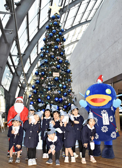 21日にツリー点灯式が行われ、市内のわかぎ幼稚園の年中児9人と同館の公式キャラクター「ごんべえ」、サンタに扮(ふん)した小野一浩副館長らがツリーの点灯を行った。カウントダウンに合わせてツリー全体に明かりがともされると、来場者からは歓声が上がり、会場は一足早いクリスマスムードに包まれた。ツリーの点灯は12月25日まで。