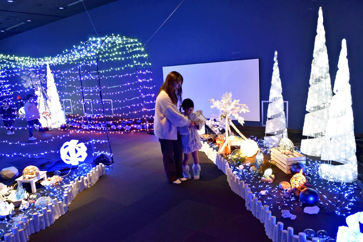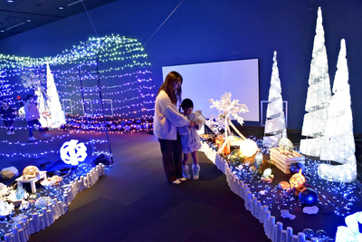 このほか1階マリンホールには、NPO法人日本渚の美術協会(東京都)の協力で、シーラカンスや海の生き物たちをテーマとしたイルミネーションが登場。海岸の漂着物などを活用したシーボーンアート作品なども展示され、幻想的な雰囲気を醸し出している。
