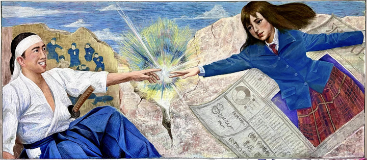 作品名は「古今の契り」。会津の歴史を象徴する白虎隊士と現代の女子高校生が互いに手を伸ばす姿を描き、過去から現代へのつながりや未来への希望を表現した。