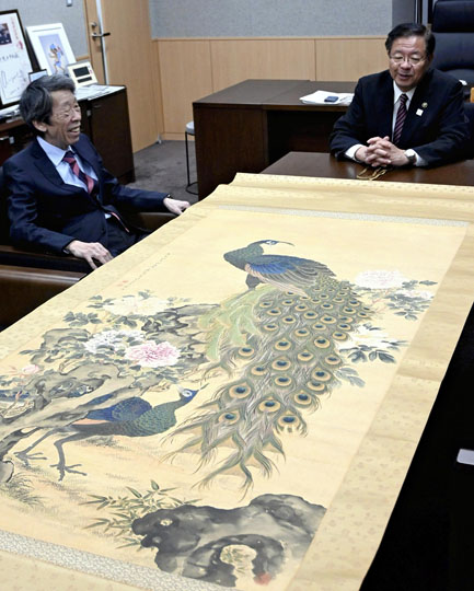 会津松平家14代当主の松平保久(もりひさ)さん(71)は25日、会津若松市に会津藩ゆかりの絵師野出蕉雨(のでしょうう)による掛け軸「孔雀」を寄贈した。