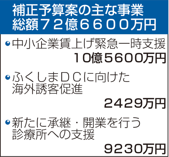 また、新たに承継・開業する診療所への支援には9230万円を計上した。昨年12月以降に開業・承継した診療所を対象に、本年度の赤字分の一部を補助し、医師確保を図る。補助率は、県内では比較的医療機関の充実している福島、郡山両市は3分の1以内、両市以外は3分の2以内とした。