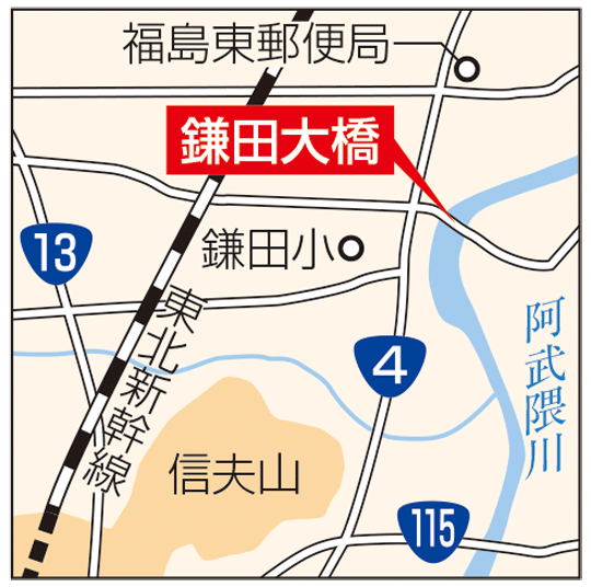 市によると、鎌田大橋は1972年に農道橋として架設され、50年超が経過している。橋長370メートルで、市が管理する橋の中で最長。国道13号と県道福島保原線をつなぎ、物流ネットワークの要を担う重要な橋だという。