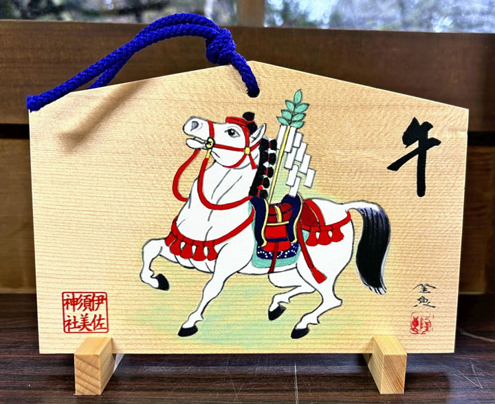 会津美里町の伊佐須美神社で参拝者に授与される「干支(かんし)美術絵馬」が完成した。来年の干支(えと)「午(うま)」が描かれており、12月1日から授与する。