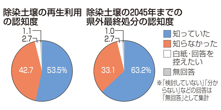 東京電力福島第1原発事故に伴う県内の除染で出た土壌などの県外最終処分を巡り、福島民友新聞社と東京大大学院の関谷直也教授が全国の自治体の首長を対象に実施した調査で、回答を得た902人のうち、42.7%に当たる385人が土壌の大半を公共工事で再生利用する方針について「知らなかった」と答えた。政府が目指す再生利用事業の全国展開に向け、受け入れの可否を判断する自治体トップに事業そのものの認知度が広がって...