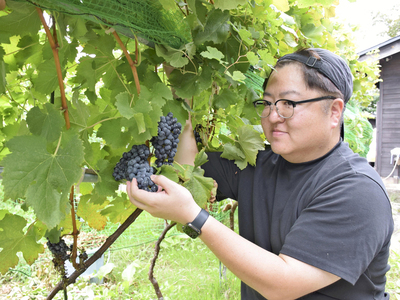 「日本酒以外にも原料から一貫して会津で生産し、自社で責任を持って食卓に届けたい」と考えた鈴木さん。原料のブドウは、会津若松市や喜多方市などの休眠畑を活用して2018年から生産を開始した。酒類製造免許取得を前に製造したブドウジュースが24年に完成。今月20日ごろから「アケボノノジュース」として販売する予定で、「甘く酸味のあるジュースとなった。ワインもおいしくなると思う」と手応えを口にする。