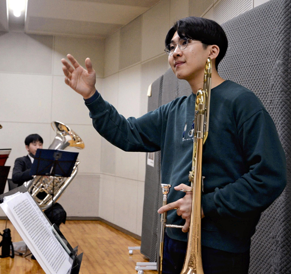 県と日本フィルハーモニー交響楽団の連携事業が11月、いわき市のアリオスで行われ、同市出身のトロンボーン奏者笠間勇登さん(26)ら団員5人が音楽に取り組む小中学生へ演奏指導を行った。