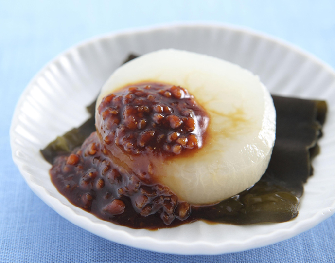 1人分117キロカロリー、塩分1.4グラム (1)2人分で大根200グラム、米小さじ1、だし昆布7センチ角2枚、鶏ひき肉20グラム、赤みそ15グラム、きび砂糖20グラム、みりん大さじ1/2を用意します。 (2)大根は厚さ2センチくらいに切り、皮を厚めにむいて面取りします。片面に2、3本の切り込みを入れます。だし昆布は表面の汚れを拭きます。 (3)鍋に大根と、お茶パックに入れた米、適量の水、だ...