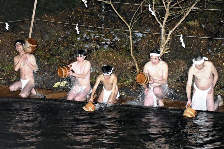 7日に福島県二本松市で行われる国指定重要無形民俗文化財「木幡の幡(はた)祭り」に先立ち、身を清める水垢離(みずごり)の儀式が6日、同市木幡地区で行われ、下帯姿の氏子らが冷水を浴びて士気を高めた。