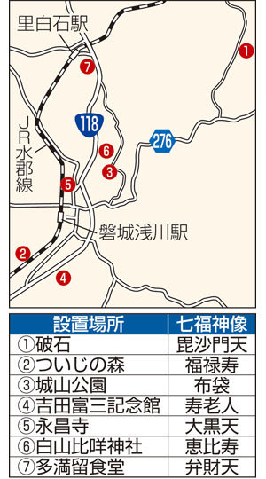 マップは町役場や町商工会で配布される。スタンプを集めた人に贈る景品や七福神に関連したイベントも検討している。清家さんは「一体一体の表情と造形に味がある。七福神を通じて町の魅力に触れ、幸せを感じてもらえたらうれしい」と願った。